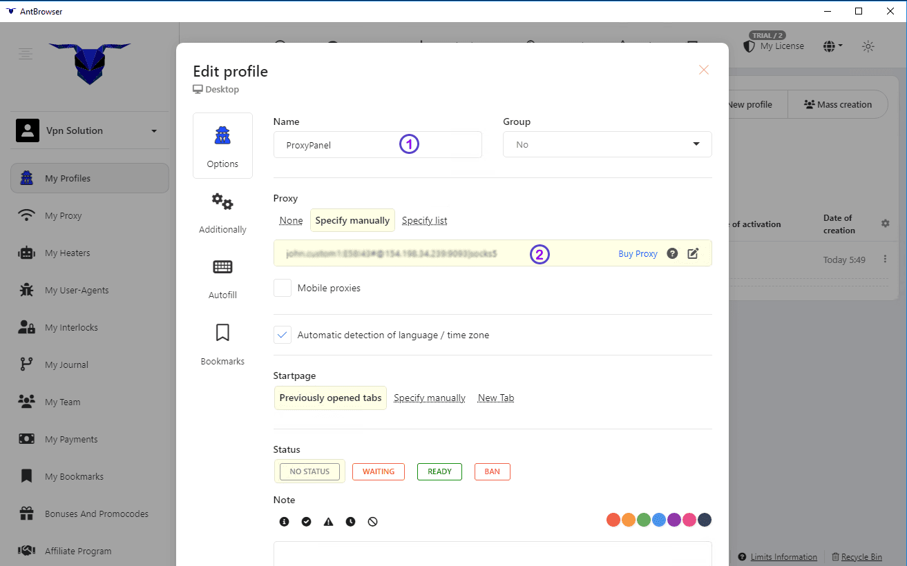 First, set a name for your profile. Then, configure your proxy settings using the following format: