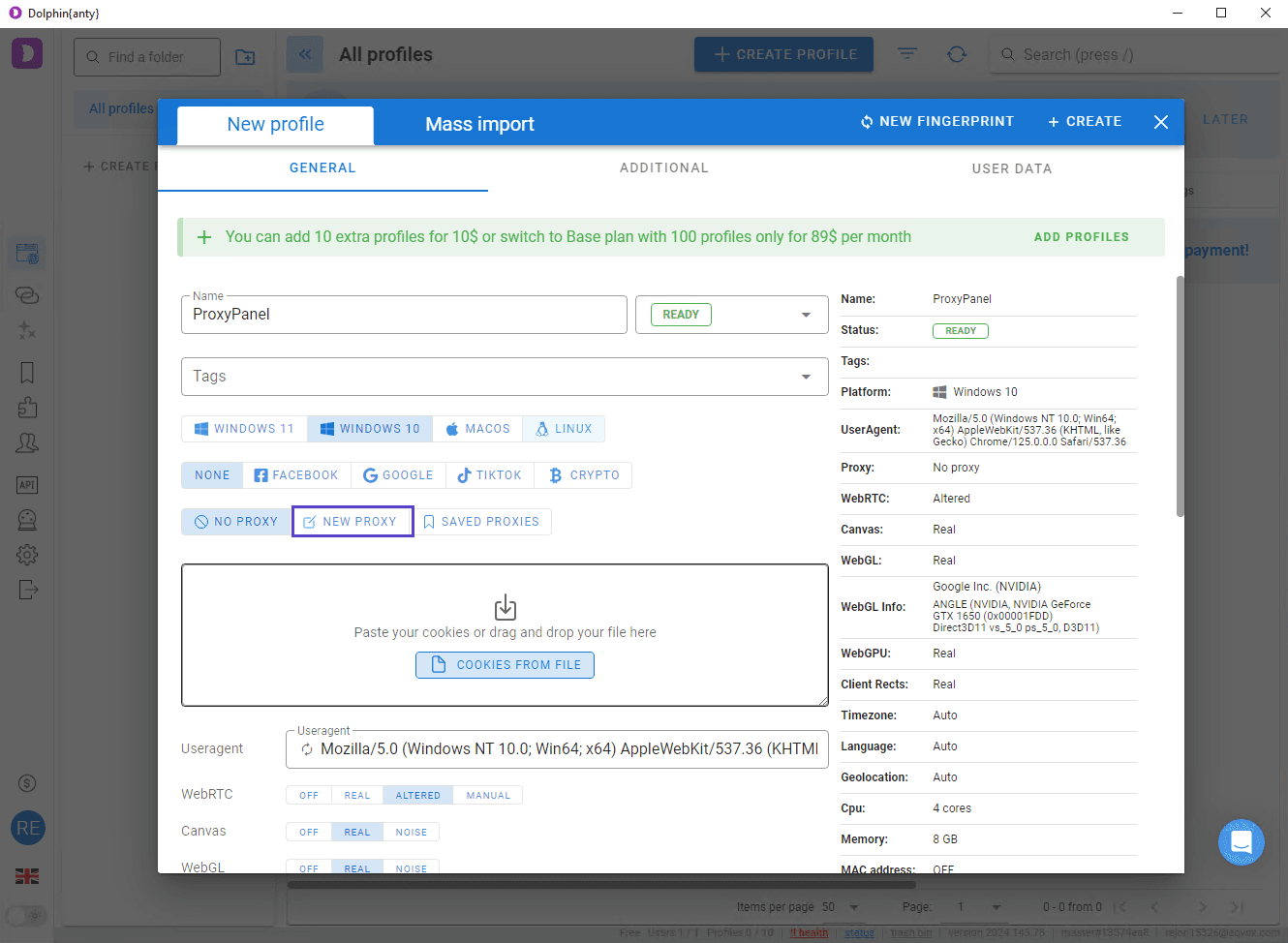 2. Set a name for your profile and configure the necessary settings. Then, click on "NEW PROXY" to configure your proxy settings.