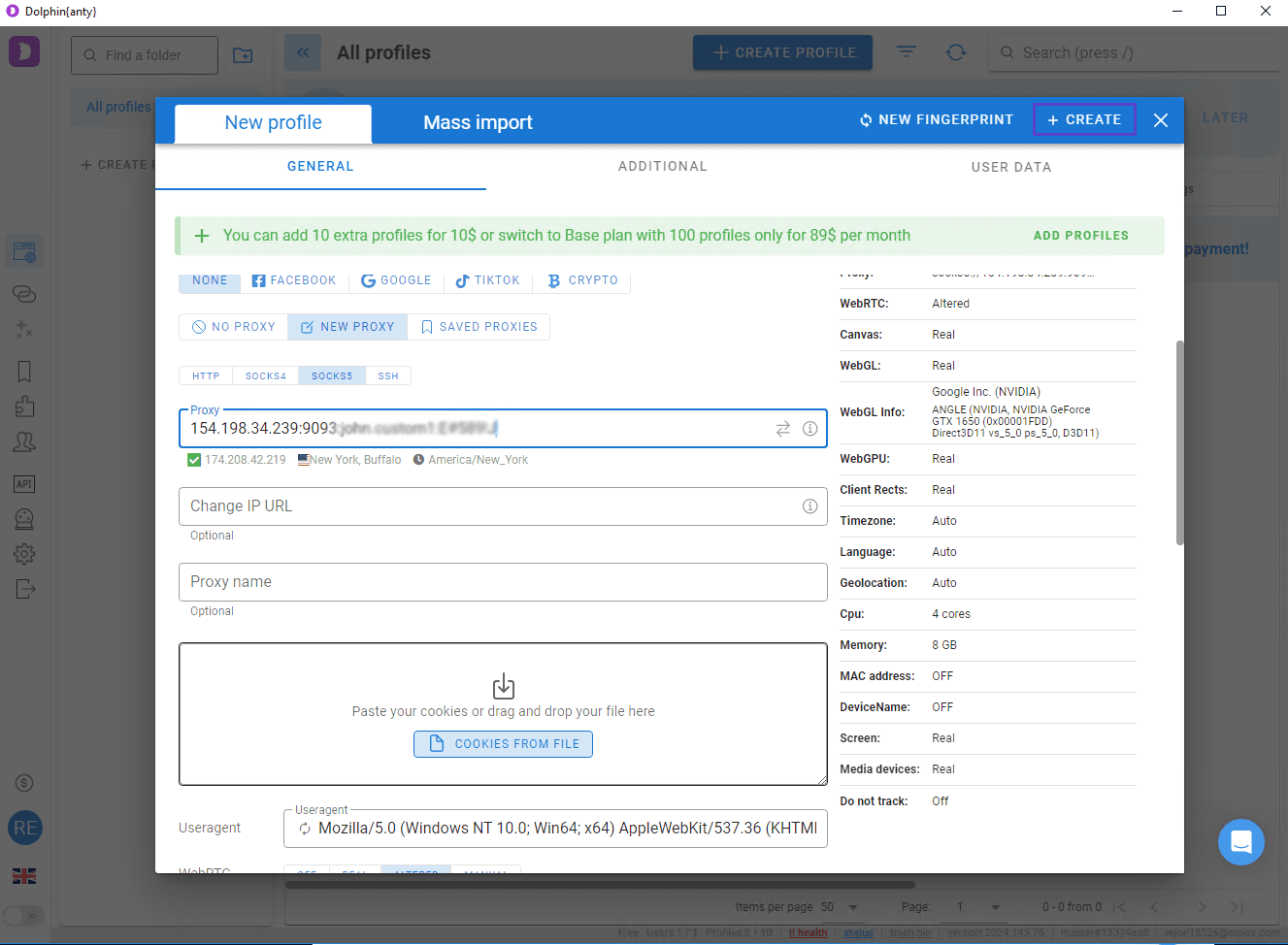 4. Proceed by entering the required details for your proxy configuration in the specified fields, then click the "+ Create" button to save your profile.