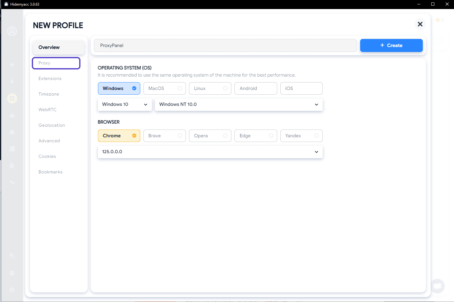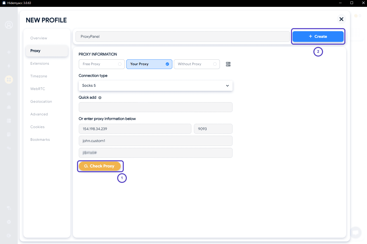 Proceed by entering the required details for your proxy configuration in the specified fields, then click the “Create" button to save your profile.