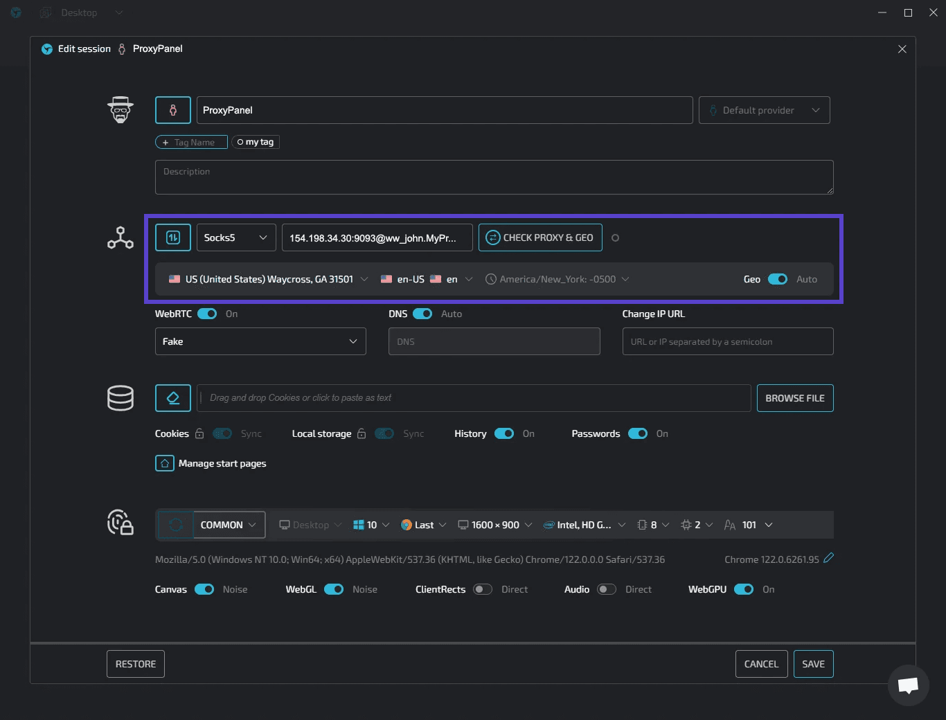 Assign a name to your session and indicate the protocol you prefer for your proxy.For easy setup, you can simply copy and paste your proxy details in the "host:port@username:password" format, available in your ProxyPanel dashboard. Once configured, verify the functionality of your proxy, then click "Save" to confirm the settings.