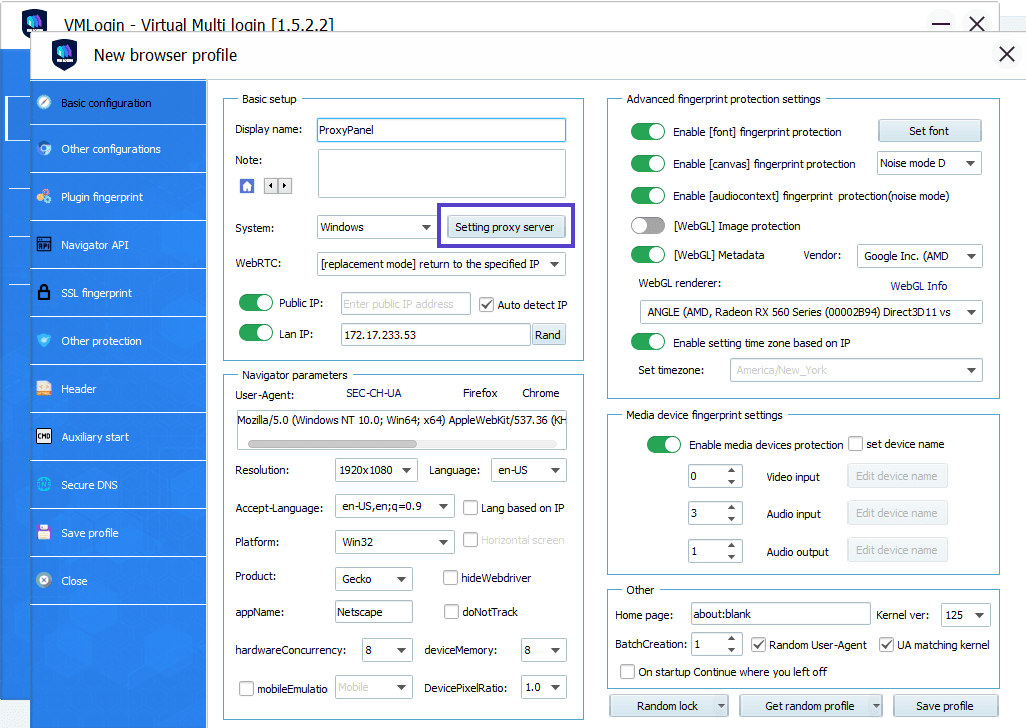 Set a name for your profile and configure the necessary settings. Then, click on "Setting proxy server" to configure your proxy settings.